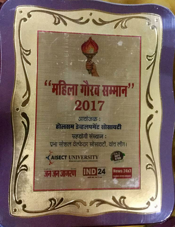 Mrs. Hemal Kamat- Secretary & Director is awarded at Regional level: As women Achiever for Empowerment of Women and children from Mahila Sashaktikaran Vighag, Indore in 8th March 2017.